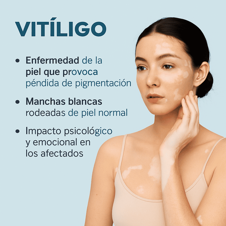 El vitíligo es una enfermedad de la piel que se manifiesta con la pérdida progresiva de pigmentación, generando manchas blancas en distintas partes del cuerpo. Aunque no es una enfermedad contagiosa ni dolorosa, sí puede tener un fuerte impacto psicológico y emocional en quienes lo padecen.