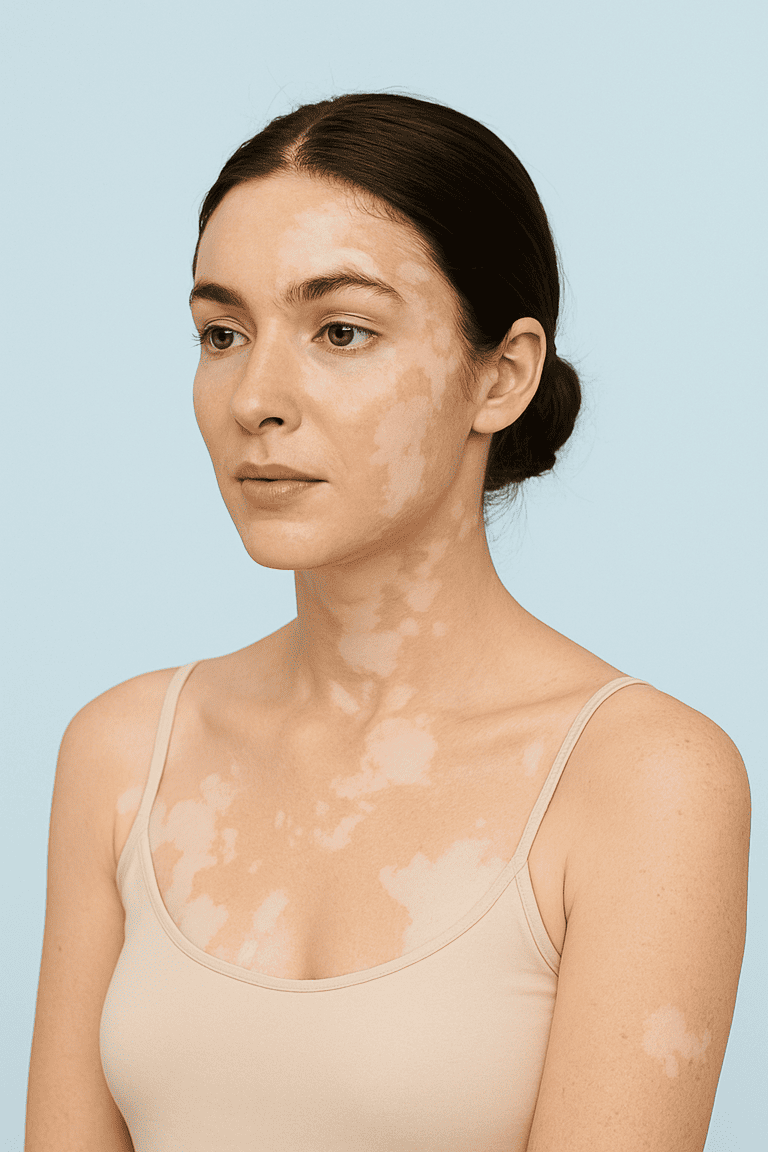 El vitíligo es un trastorno autoinmune en el que las células encargadas de producir melanina (melanocitos) se destruyen de manera progresiva, lo que genera áreas despigmentadas en la piel. Puede afectar cualquier parte del cuerpo, aunque las zonas más comunes son: manos, rostro, cuello, axilas y genitales. También puede afectar el cuero cabelludo, haciendo que el cabello en esas áreas pierda su color.